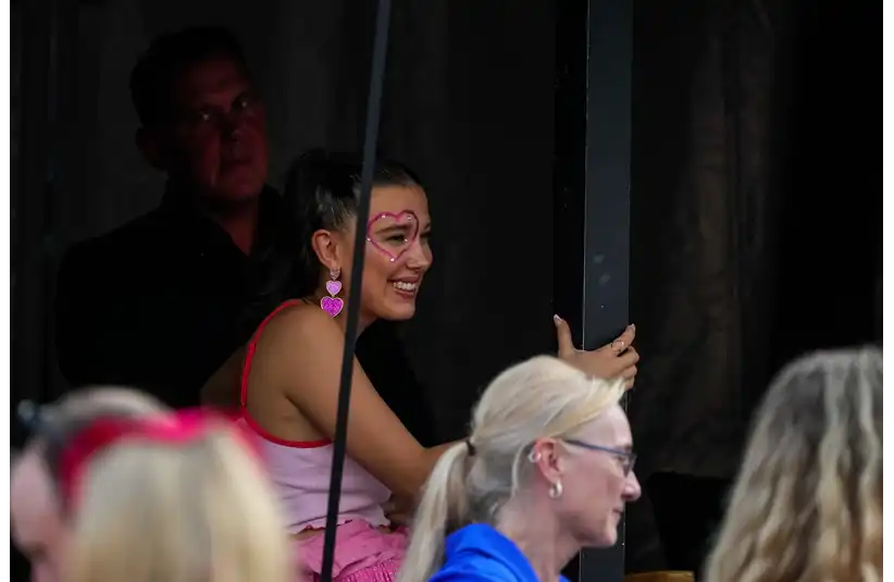 Actress Millie Bobby Brown watches from a VIP tent before Taylor Swift performers during the first night of the Cincinnati stop of the Eras Tour at Paycor Stadium in downtown Cincinnati on Friday, June 30, 2023. © Sam Greene / USA TODAY NETWORK via Imagn Images