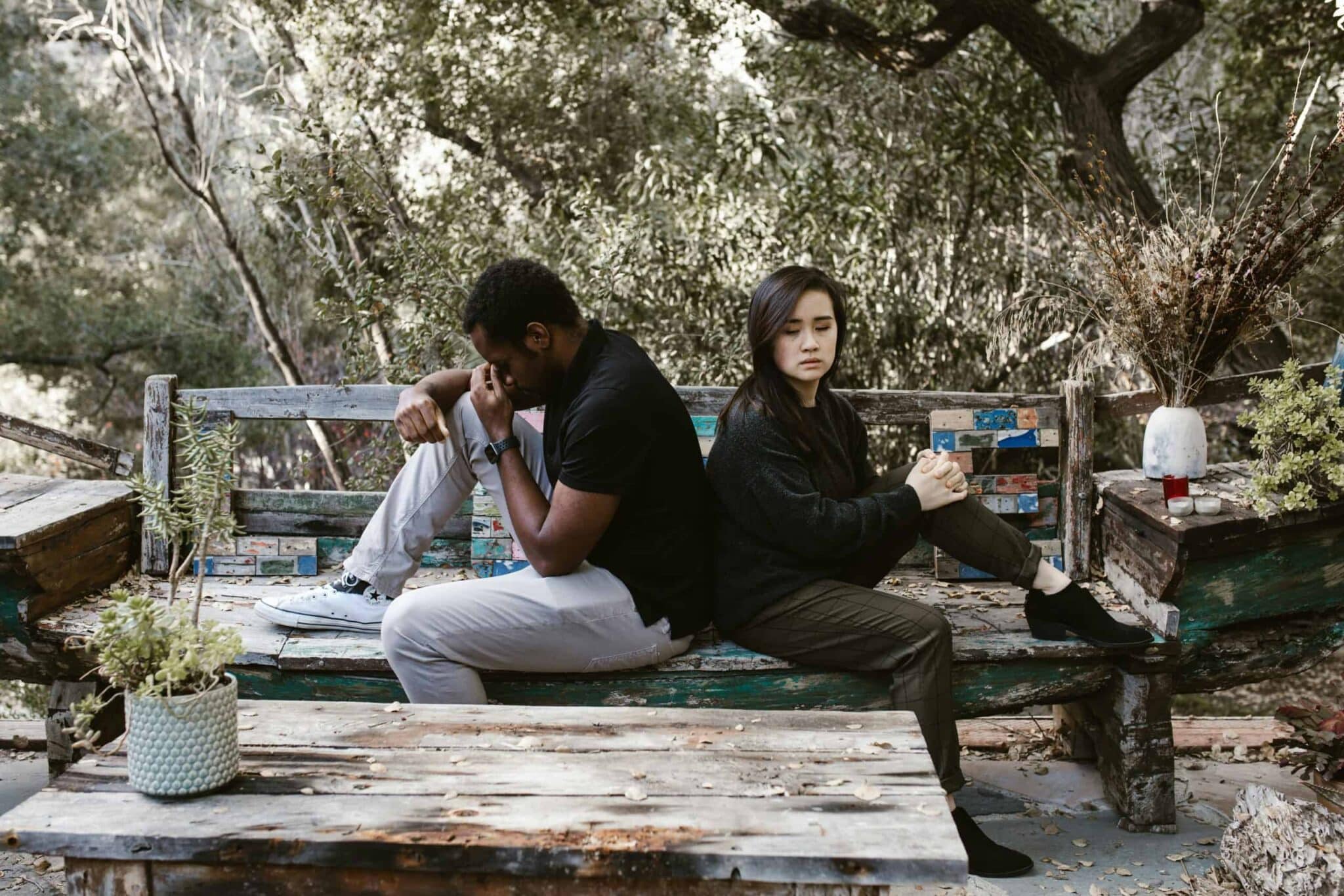 Infidelity, cheating, A couple sits back to back on a wooden bench, indicating a disagreement or breakup.