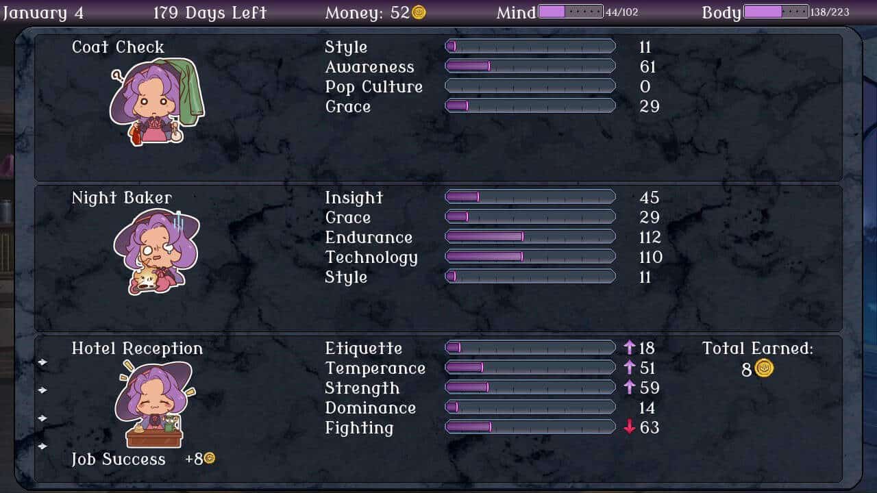 The gameplay is similar to Hanako Games’ insanely difficult royalty sim, Long Live the Queen. Thankfully, this game is much easier, though it is still possible to die. The jobs and classes you emphasize and the choices you make during the story determine which ending you’ll get, and there are over twenty endings to obtain. Your vampire mistress might pursue a career, discover her origins, or set out to conquer the world. You can play over and over in search of all the endings.