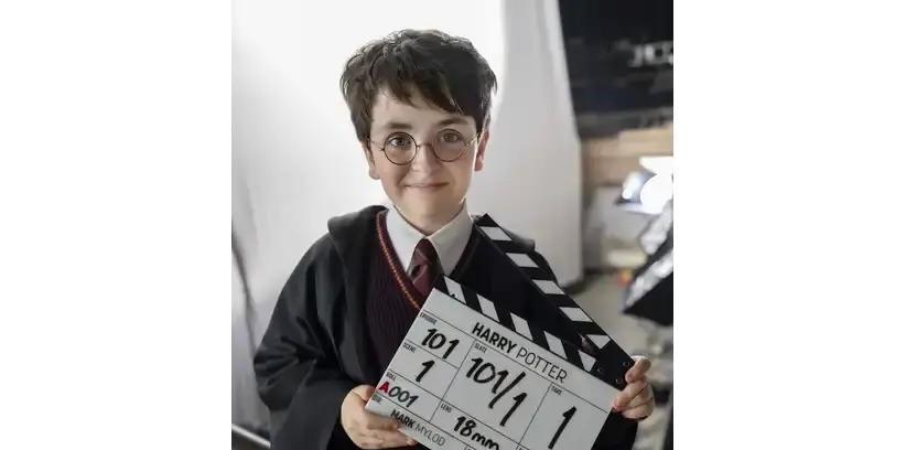 Dominic McLaughlin, as Harry Potter dressed in a wizard costume, resembling a famous fictional character, stands smiling on a film set, holding a movie clapperboard confidently.