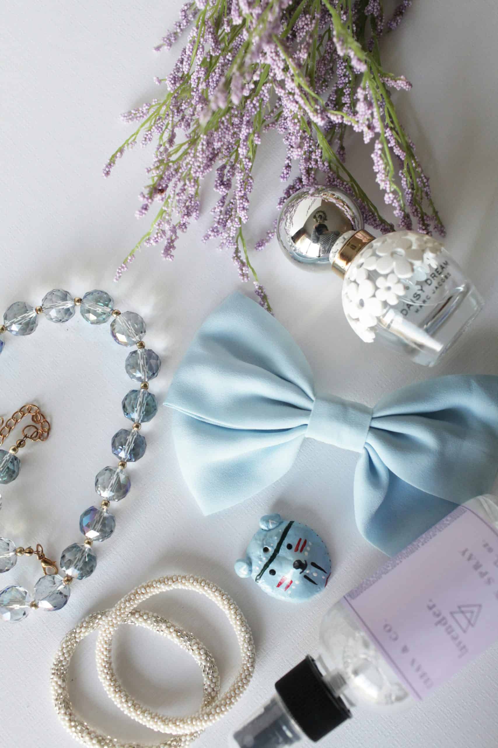 Flat lay of lavender, bow, jewelry, and perfume creating an elegant arrangement on a white background.